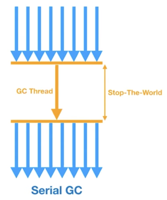 하나의 스레드로 GC를 실행하는 방법을 말한다. 하나의 스레드로 실행시키다보니 Stop The World 시간이 매우 길다. Single 스레드나 Heap이 매우 작을 때 사용한다.