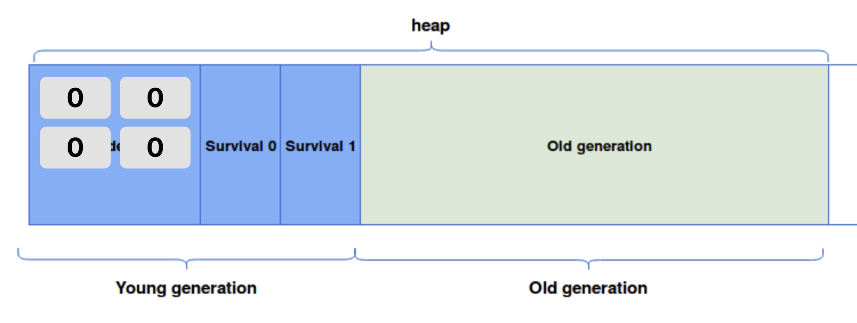 다시 돌아와 정리하자면, JVM의 Heap 영역은 크게 Young generation과 Old generation으로 나뉜다. 그리고 Young generation은 다시 Eden과 Survival 0, 1로 나뉜다.