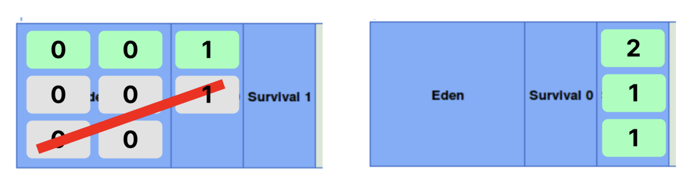 다시 Eden 영역이 꽉차고 GC가 발생하면 살아남은 객체가 Suvival 1 영역으로 이동한다.