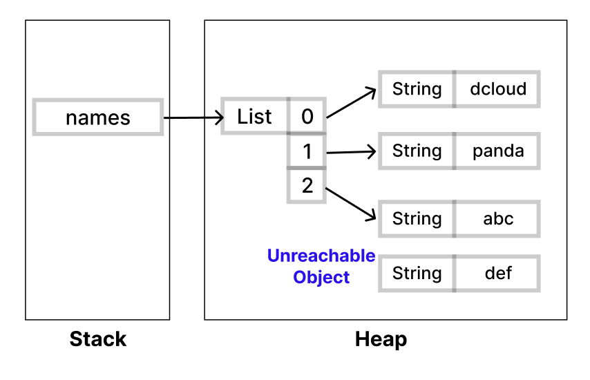만약 위 그림처럼 어떤 변수도 가리키지 않는 Heap의 영역을 Unreachable Object라고 하고 이것이 가비지 콜렉터가 해제할 대상이 된다.