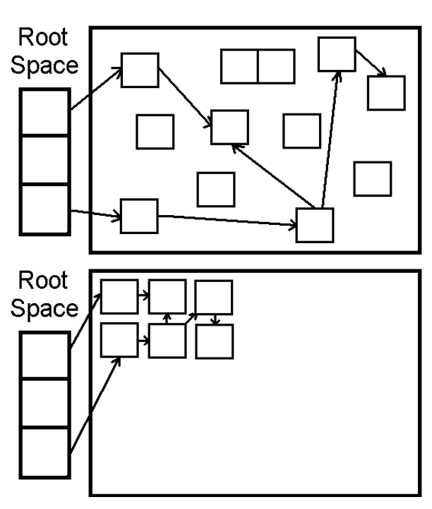 그림에서 Root Space는 스택 변수, 전역 변수 등 Heap 영역 참조를 담은 변수이다.