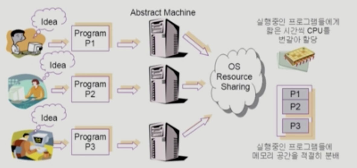 - 운영체제는 동시 사용자/ 프로그래밍들이 각각 독자적 컴퓨터에서 수행되는 것 같은 환상을 제공