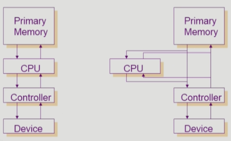 DMA controller의 역할은 위에서 언급한 인터럽트 벡터가 존재하는 이유와 비슷합니다. 인터럽트는 매우 빈번하게 발생하기 때문에, CPU가 일일히 인터럽트를 처리한다면 CPU가 방해를 많이 받게됩니다. 그렇기에 I/O device의 local buffer에서 들어오는 작업이 종료되었다면, DMA controller가 직접 그 내용을 메모리로 block 단위로 직접 전송해줍니다. 그리고 복사가 끝나면 CPU에 인터럽트를 걸어 메모리에 작업이 복사된 것을 알려주고 CPU는 인터럽트를 처리하게 됩니다.