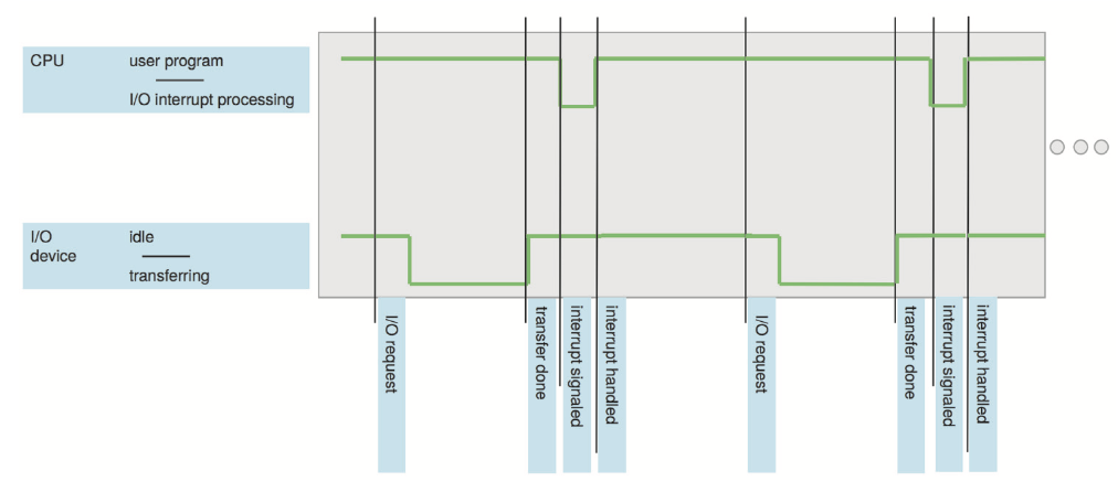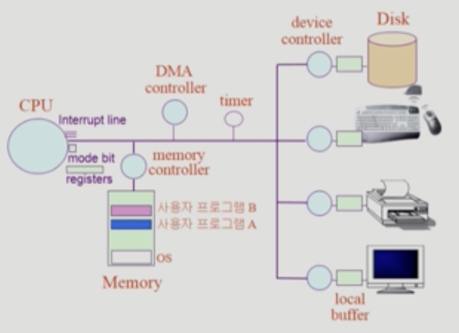 이번 포스팅에서는 위 사진에서 I/O Device와 관련된 구조, interrupt, mode bit, timer, DMA controller를 알아보겠습니다.