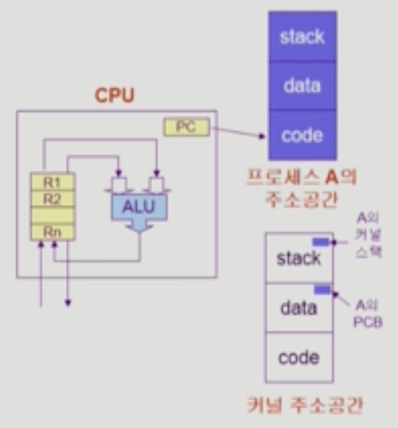 그런데 이 커널이라는 것은 여러 프로세스들이 공유하는 자원입니다. 그렇기에 어떤 프로세스든 운영체제에 요청하여 커널의 코드를 실행하게 되면 이 커널이 어떤 프로세스의 요청을 받고 실행하는지가 구분되어야 합니다. 그래서 프로세스 별로 커널의 스택을 별도로 두고 있습니다. 그래서 프로세스의 현재 상태를 규명하기 위해서는 특정 프로세스의 커널 스택도 어떤 내용을 쌓고 있는지 그 프로세스를 파악하기 위해 필요합니다.