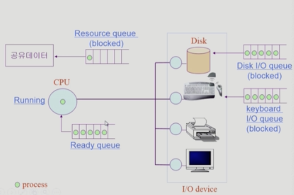 CPU는 굉장히 속도가 빠르고 여럿이서 공유하는 자원이기 때문에 하나의 프로세스만이 접근할 수 있습니다(사진의 가운데 초록 점이 프로세스). 하나의 프로세스가 CPU에서 Running을 하고 있다가 타이머 인터럽트가 들어오면 CPU를 뺏기고 맨 뒤(queue)에 줄을 서고 그 다음 프로세스가 CPU를 얻고 이런 식으로 돌아가면서 CPU를 사용하게 되어있습니다.
