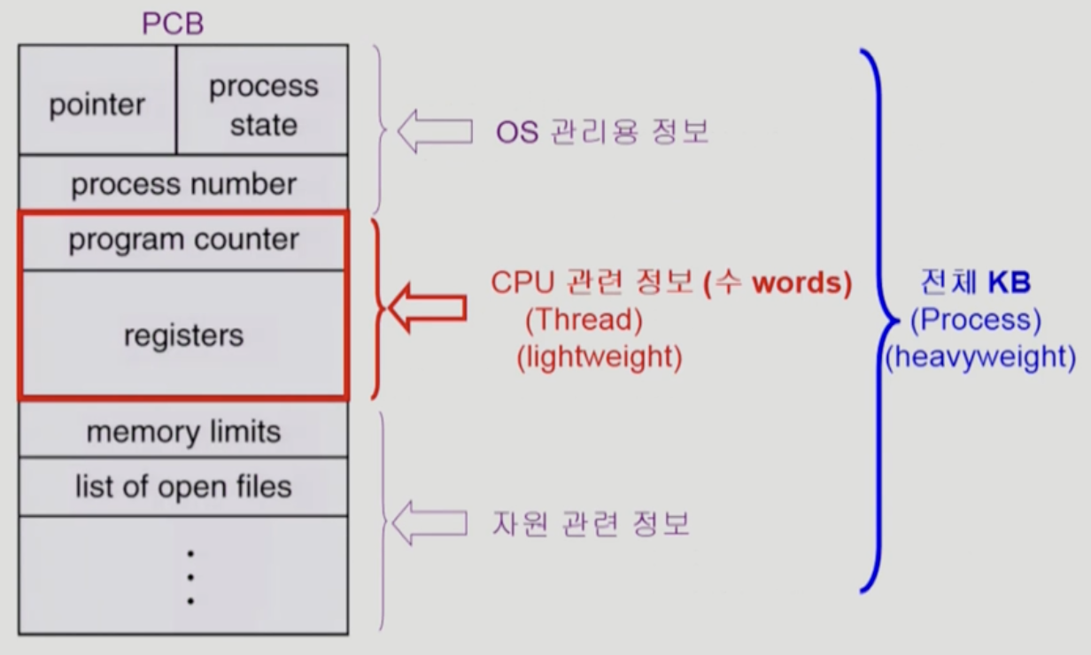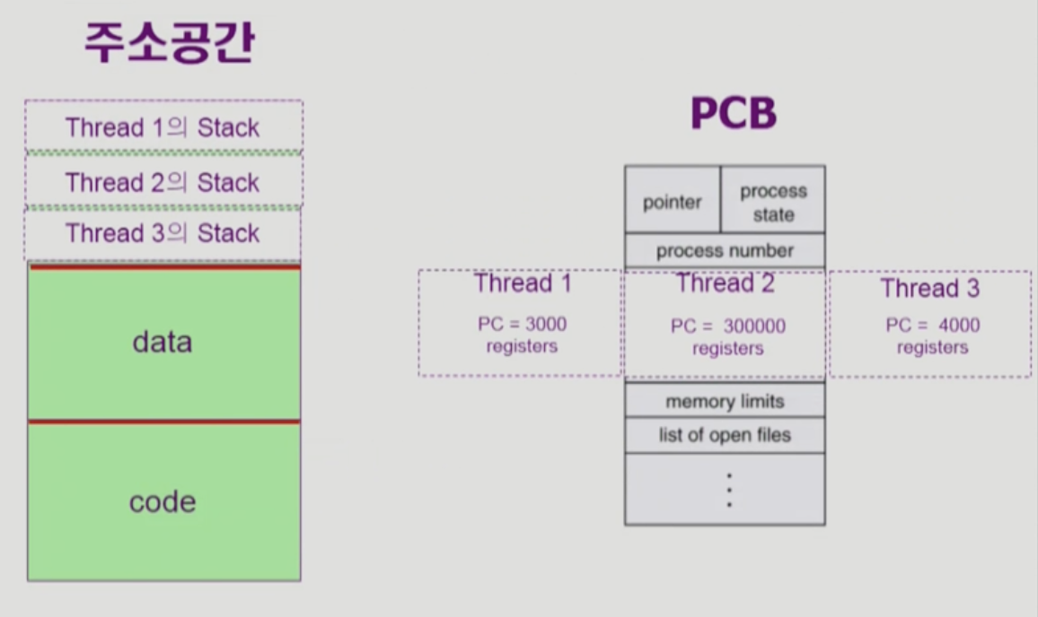 같은 일을 하는 프로세스를 여러 개 띄워놓고 싶으면, 메모리 공간만 하나 띄워놓고 각 프로세스마다 다른 부분의 코드를 실행할 수 있게 해주면 메모리를 보다 효율적으로 사용할 수 있습니다. 하나의 주소 공간에 CPU 수행 정보에 관련된 것들은 여러 개를 두는 것입니다.