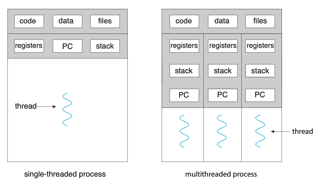 즉, 스레드란 CPU를 수행하는 단위를 말하는 것이고 스레드를 구성하는 것은 Program counter, Register set, Stack으로 정리 할 수 있습니다. 그리고 스레드끼리 공유하는 부분(code section, data section, OS resources)는 task라고 부릅니다.