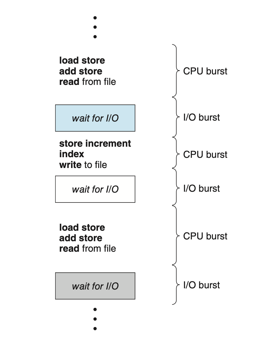 프로그램 종류마다 다르게, I/O가 많이 끼어들지 않는 프로그램의 경우에는 CPU에서 인스트럭션을 실행하는 단계인 CPU burst가 길게 나타나고 반대로 I/O와의 상호 작용이 많은 프로그램 같은 경우에는 CPU를 연속적으로 쓰는 단계가 짧습니다.