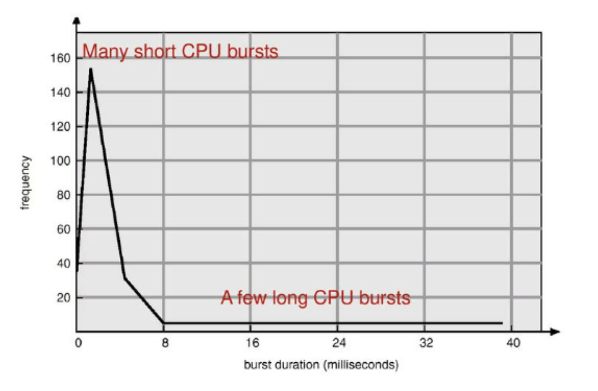 그래서 CPU를 연속적으로 쓰는(CPU burst)를 아래와 같은 그래프로 뽑아보면, CPU burst 가 짧은 경우가 빈번하고 CPU burst가 긴 경우는 간혹 나타나는 것을 볼 수 있습니다. 컴퓨터 시스템에서 돌아가는 프로그램들은 모두 동일한 패턴을 가진 것이 아닌 CPU burst가 긴 경우와 짧은 경우가 섞여있는 것입니다.