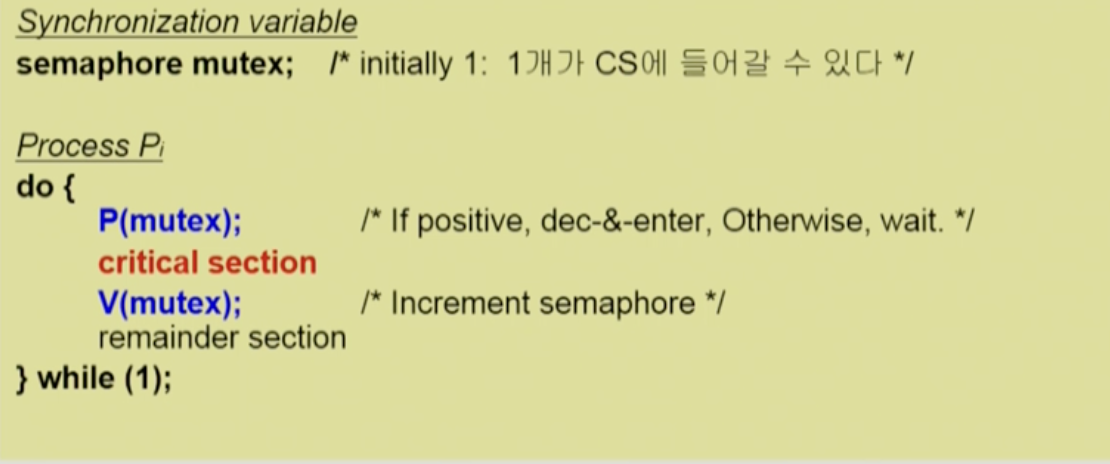 여기서도 마찬가지로 공유 데이터에 접근하려고 할 때, 다른 프로세스가 공유 데이터을 사용하고 있다면 그 프로세스가 공유 데이터를 내어주기 전까지는 사용할 수 없는 것입니다. 다시 말해, 프로세스가 while 문을 돌고 있는 것이 아니라 blocked 상태로 잠들어있다가 공유 데이터 사용이 끝나면, 그 때 다시 깨어나 Ready Queue에 들어오는 것입니다.