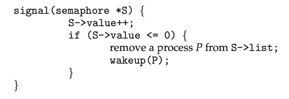 자원을 다 쓰고 반납하는 과정입니다. 세마포어 값을 1 더해주고 만약 자원을 내놓았는데도 불구하고, 값이 0 이하라면 프로세스를 기다리며 잠들어있는 다른 프로세스가 있다는 것입니다. P 연산을 다시 보면 세마포어를 먼저 감소시킨 후에 리스트에 연결을 하는 것을 볼 수 있는데, 먼저 감소를 시켰기 때문에 그 값이 반영된 것이라 생각하면 이해가 편할 것입니다. 그래서 세마포어 값이 0 이하라면 자원을 반납하고 끝인게 아니라 잠든 프로세스를 깨우는 작업이 함께 있습니다.