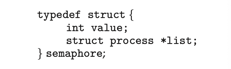여기서 int value; 는 세마포어 변수, struct process *list; 는 프로세스의 wait queue입니다. wait queue는 세마포어 때문에 잠들어있는 프로세스들을 연결하기 위한 큐 형태로 만들어집니다.