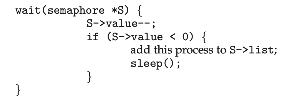 그래서 여기서의 세마포어 값은 단순히 자원의 개수만을 나타내는 것이 아니라, 음수라면 기다리며 잠들어 있는 다른 프로세스가 있다는 상태도 나타냅니다.