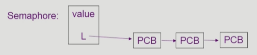 만약 세마포어를 획득할 수 없으면 그 프로세스를 Blocked 시키게 되고, 누군가 세마포어를 쓰고 나서 반납하게 되면 Blocked 된 프로세스들 중에서 하나의 프로세스를 wake-up 시킵니다. 세마포어 변수, 즉 자원을 획득하지 못한 프로세스들의 PCB는 세마포어 변수에 연결해줍니다.