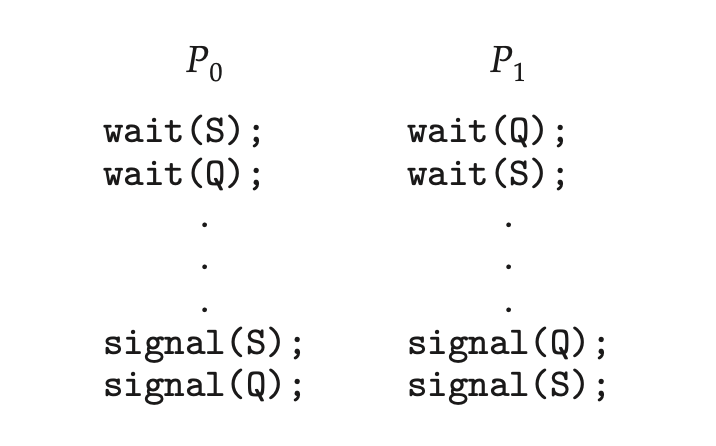 프로세스 0이 CPU를 얻어 세마포어 S를 획득한 다음 CPU 제어권을 빼앗겨 프로세스 1에게 넘어갔는데, 프로세스 1이 세마포어 Q를 획득하고 프로세스 S를 획득할려고 했더니 이미 프로세스 0이 획득한 상태입니다. 이렇게 되면 프로세스 0이 S를 내놓아야하는데 프로세스 0은 자원 Q를 얻고 작업을 끝내야 S를 반환하기 때문에 영원히 기다려야하는 문제가 발생하는 것입니다.