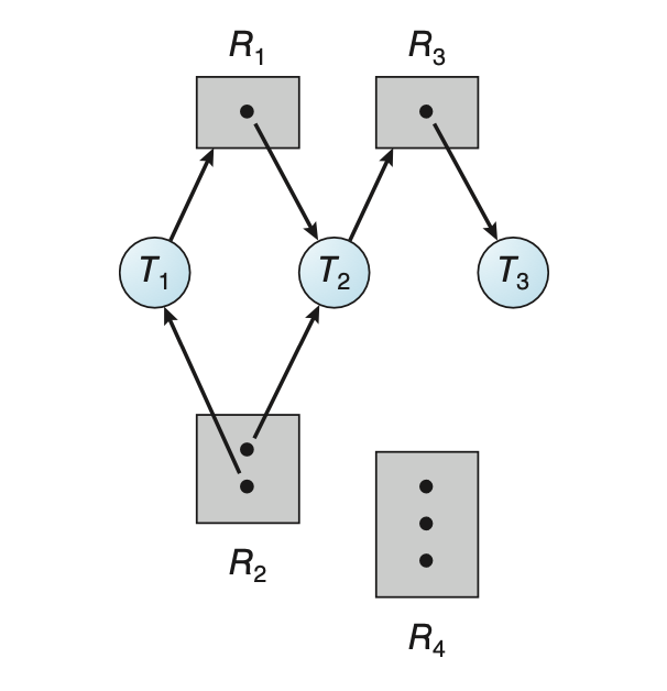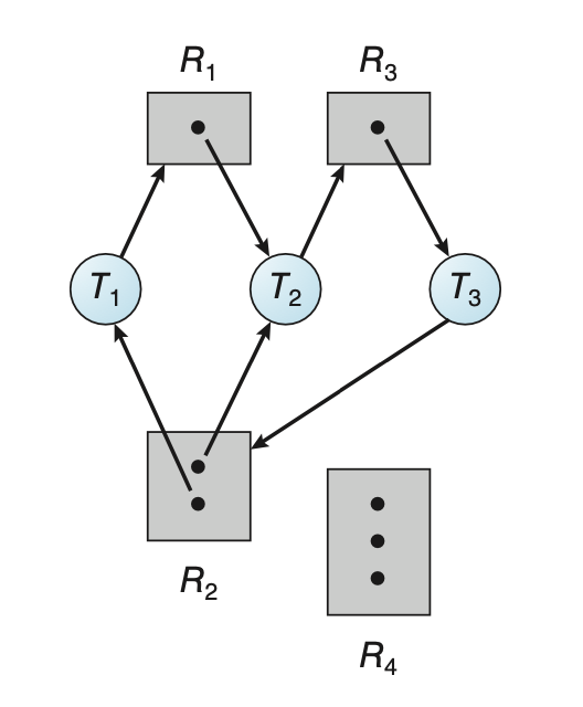그림에서 T 동그라미는 프로세스를 나타내고, R 사각형은 자원을 나타냅니다. 사각형 안의 작은 점들은 자원의 수를 의미합니다. 그리고 프로세스와 자원 사이에는 화살표가 있습니다. 화살표가 자원에서 프로세스로 향하는 화살표는 이 자원이 프로세스에 속해있다는 것을 알려주고, 프로세스에서 자원으로 향하는 화살표는 프로세스가 이 자원을 요청했다는 것을 의미합니다. 요청만 하고 아직 얻지는 못한 상태입니다.