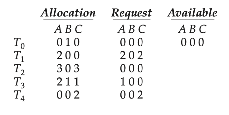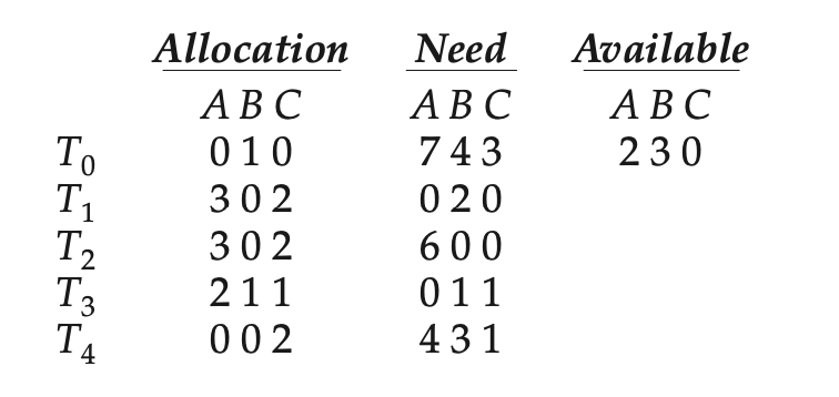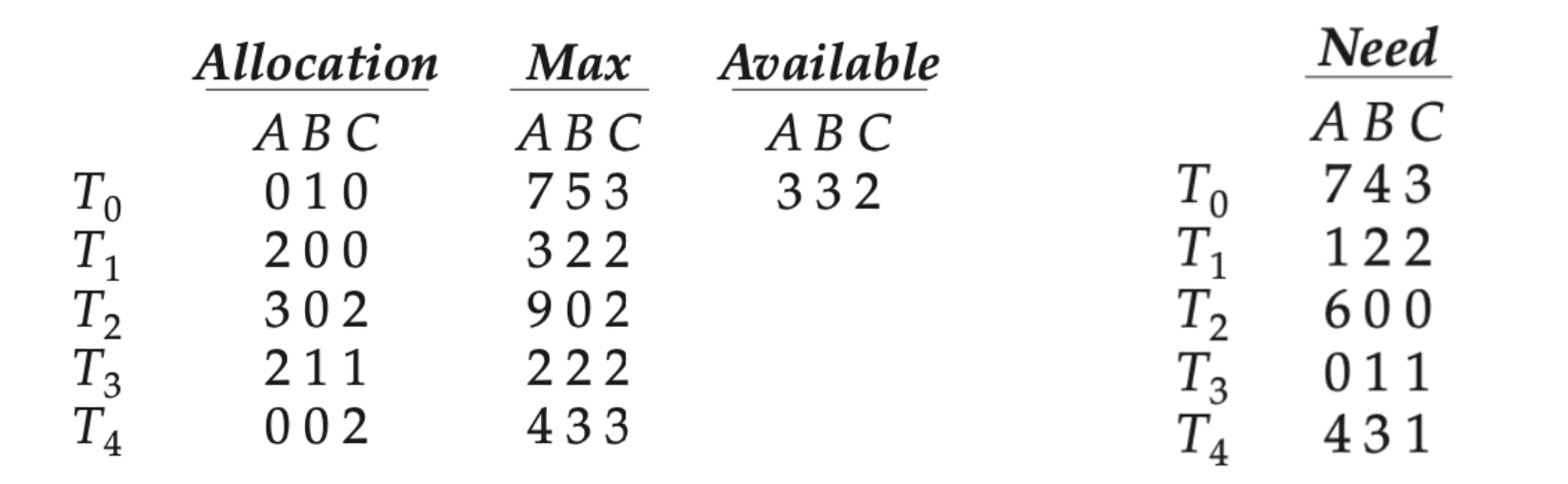위 그림에서는 5개의 프로세스, 3 종류의 자원이 있고 자원은 종류 별로 각각 10개(A), 5개(B), 7개(C)가 있습니다. 프로세스 0은 B 자원을 1개, 프로세스 1은 A자원을 2개.. 이런 식으로 자원을 가지고 있는 상황입니다. Max는 프로세스가 시작할 때 정해놓는 최대 사용 자원입니다. Need는 최대 요청 가능한 양에서 현재 할당된 양을 뺀 값으로, 추가 요청할 수 있는 양입니다.