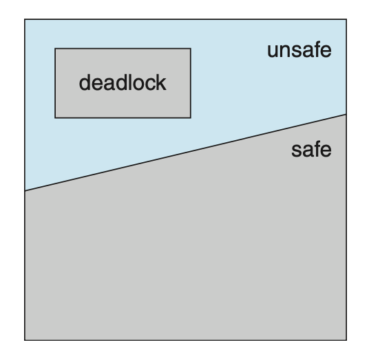 시스템이 safe 영역에 있다면 데드락의 가능성이 없는 것이고, unsafe 영역에 있다면 데드락의 가능성이 있는 것입니다. 데드락 avoidance는 데드락이 unsafe state에 있는 것을 보장합니다.