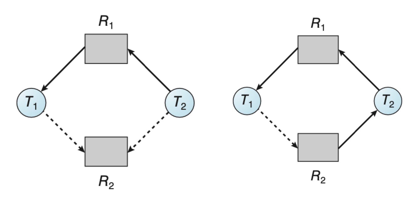 Circular wait은 모든 자원 유형에서 할당 순서를 정해서, 정해진 순서로만 자원을 할당하는 방법이 있습니다. 원천적으로 데드락을 막을 수는 있지만 자원에 대한 이용률이 낮아지고, starvation 문제가 생겨 전체 시스템이 나빠지는 문제가 발생할 수 있습니다. 매우 적게 발생하는 데드락을 막기 위해 제약 조건을 많이 걸어놓는다면 비효율성이 큽니다.