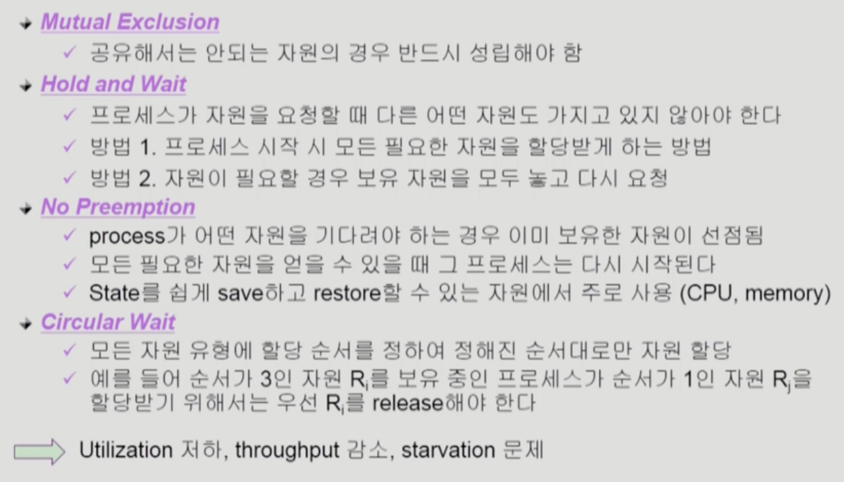 - Prevention (예방) : 자원 할당 시 Deadlock의 4가지 필요조건 중 하나가 만족되지 않도록 하는 것