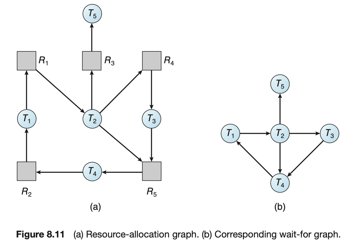 자원할당 그래프에서 사이클은 곧 데드락을 의미합니다. 우측의 자원이 그려지지 않은 그래프는 wait for graph라고 하는데, 자원할당 그래프를 변형해 프로세스만으로 노드가 구성한 것입니다. Wait-for-Graph 알고리즘을 통해 사이클이 존재하는지 여부를 주기적으로 조사합니다. 여기서 사이클을 찾는 오버헤드는 O(n^2)입니다.(노드가 n개면 화살표의 최대 개수는 n - 1 이므로 n^2-n의 시간 복잡도가 도출)