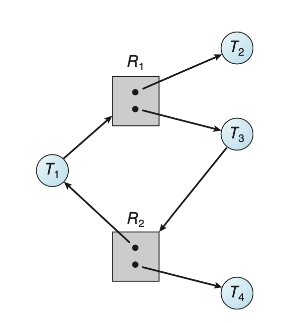 위 그래프에서는 사이클이 보이긴 합니다. 하지만 자원의 개수가 2개씩 할당되어 있기 때문에 데드락은 아닙니다.