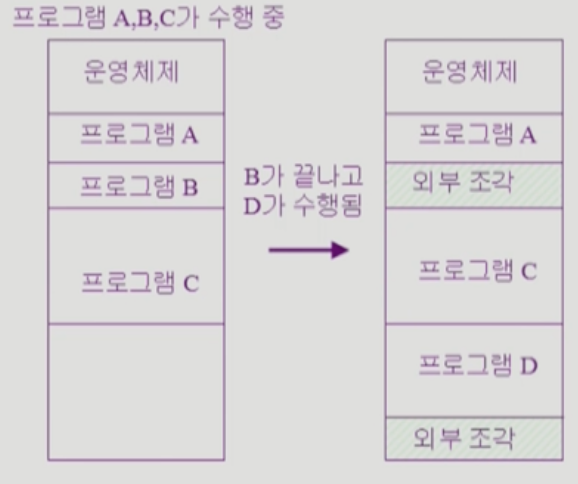외부 조각은 올리려는 프로그램보다 분할된 메모리 조각의 크기가 작아(메모리 조각<프로그램) 사용이 되지 않는 것입니다. 크기가 작아 프로그램이 올라갈 수 없습니다.