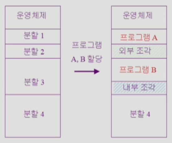 위 그림에서 프로그램 A는 분할 1에, 프로그램 B는 분할 3에 들어갈 수 있습니다. 하지만 프로그램 B는 분할 2에 들어가기엔 크기가 커서 분할 2에는 들어가지 못합니다. 이런 경우에 낭비되는 메모리 조각이 생기고, 이 조각은 외부 조각(External fragmentation)과 내부 조각(Internal fragmentation)으로 나누어 설명할 수 있습니다.