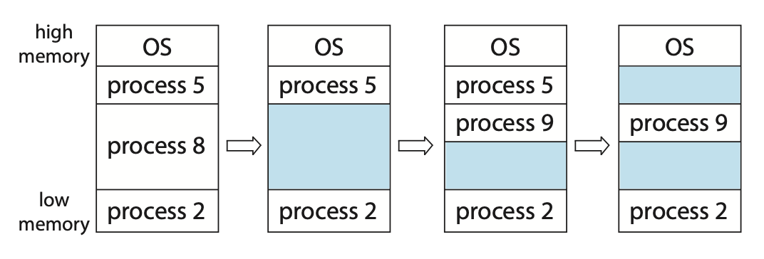 위에서 언급한 방법 외에도, compaction은 작은 hole들을 한 곳으로 몰아 넣는 방법입니다. 외부 조각으로부터 생기는 hole들을 한 군데로 모아 아주 큰 홀을 만들면 Hole의 크기가 작아 사용하지 못했던 문제를 해결할 수 있습니다. 실행 중인 프로그램의 메모리를 한 군데로 모으는 작업이기 때문에 매우 비용이 많이 드는 방법입니다. 실행 중에도 메모리를 옮길 수 있는 Run time binding이 지원되어야 Compaction을 할 수 있고 프로세스의 주소가 실행 시간에 동적으로 재배치 가능한 경우에만 수행될 수 있습니다.
