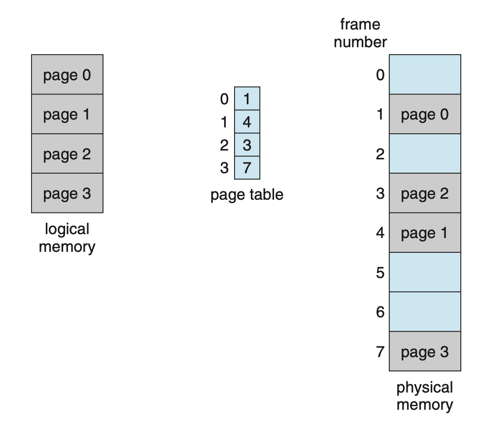 Paging 기법은 프로그램을 구성하는 논리적 메모리(가상 메모리)를 동일한 사이즈의 page 단위로 나누어, 각각의 페이지 별로 물리적인 메모리에 올리는 것입니다. 물리적 메모리에 올릴 때에도 페이지 일부는 backing store에, 일부는 물리적 메모리에 올릴 수 있고 페이지 단위로 불연속적으로 올라갈 수 있습니다.
