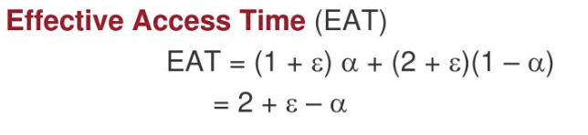 알파(α) 의 비율만큼 TLB에 접근하는 입실론에 메인 메모리에 접근하는 시간 1을 더한 시간을 곱한만큼 걸리고, 주소 변환 정보가 없는 비율인 (1-α )와 메모리에 두 번 접근하는 시간 2에 TLB에 접근하는 시간을 더한 값을 곱해주면 Miss Time 이 나오게 됩니다.