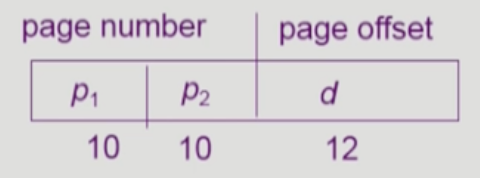32비트 주소 체계에서는 page offset과 p1, p2가 각각 몇 비트로 표현되어야 하는지 계산할 수 있는데, 먼저 비트 수를 알기 위해 제일 안쪽부터 차례로 올라가면 됩니다. 페이지 하나의 크기가 4KB이기 때문에 byte 단위로 주소 구분을 하려면 12bit가 필요합니다. 따라서 page offset은 12bit로 표현됩니다.