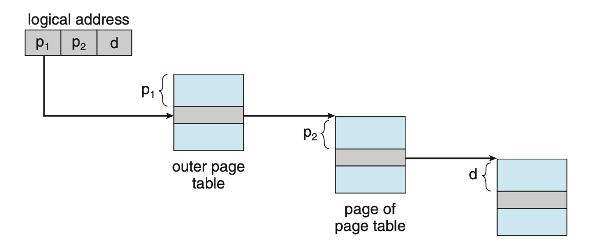 Two-level Page Table은 메모리를 페이지 단위로 나누고, 각 페이지에 대한 페이지 테이블을 사용하는 것입니다. 다시 말해, 전역(바깥쪽) 페이지 테이블과 지역(안쪽) 페이지 테이블의 두 단계 테이블을 사용합니다.
