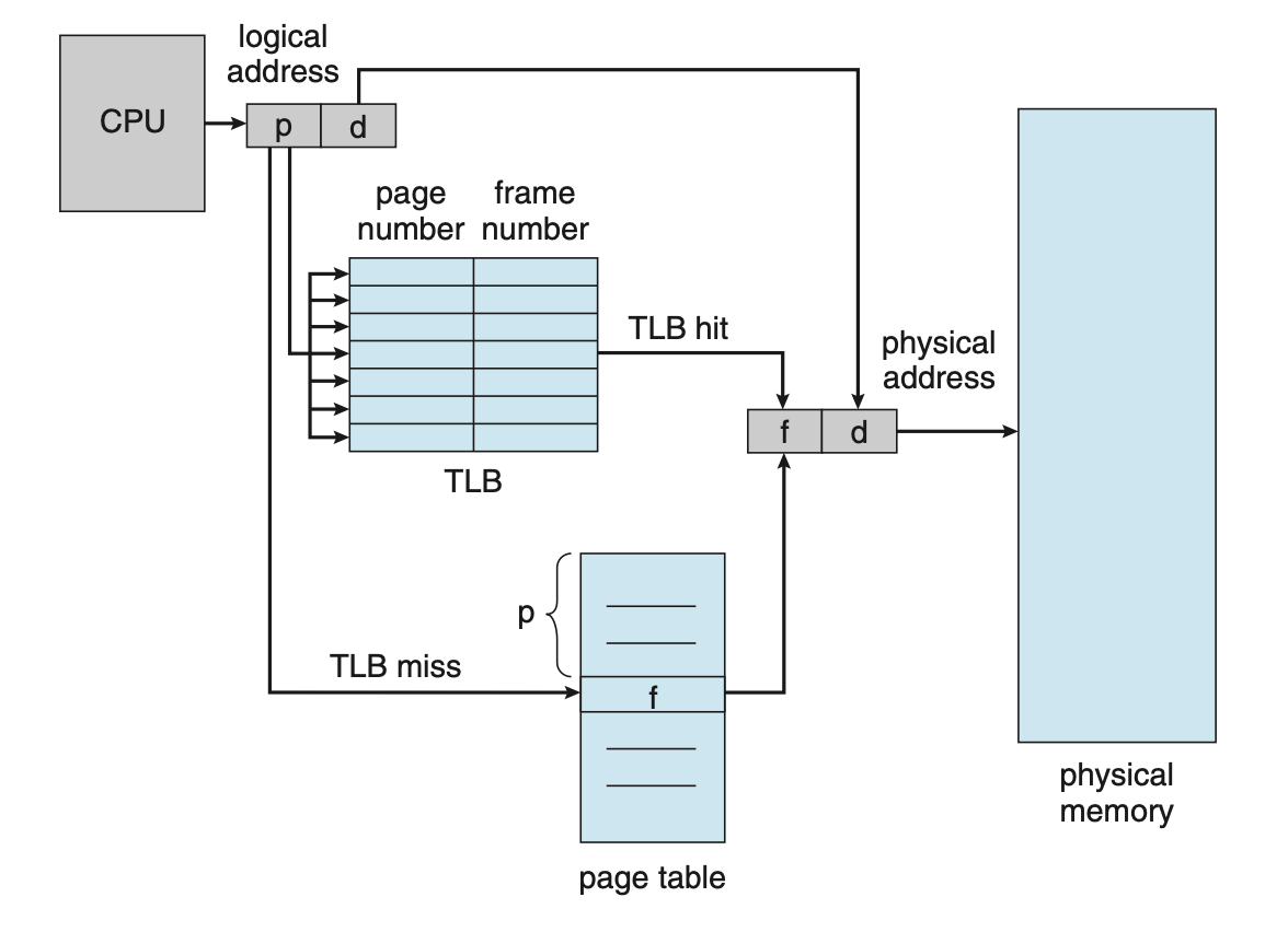 CPU가 논리적 주소를 주면 메모리 상에 있는 Page Table에 접근하기 전 TLB를 먼저 검색하게 됩니다. TLB에 저장된 정보를 통해 주소 변환이 가능한지를 체크하는 것입니다. 만약 p에 해당하는 entry가 TLB에 이미 저장되어있다면 TLB를 통해 바로 주소 변환이 이루어 집니다. 그렇게 되면 주소 변환을 한 채로 물리적 메모리에 접근하기 때문에 메모리에 한번만 접근하면 되는 것입니다. TLB가 없는 경우에는 TLB miss가 발생했다고 표현합니다. 이 경우에는 Page Table을 통해 일반적인 주소 변환으로 메모리에 접근합니다.