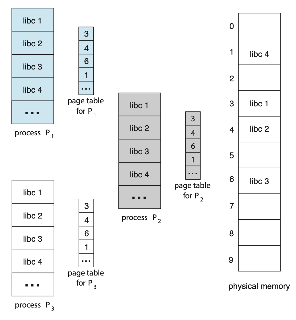 나머지 한 가지는 동일한 논리적 주소에 위치해야합니다. 각 프로세스가 같은 코드에 접근해야 하므로 코드가 메모리에 로드될 때마다 같은 논리적 주소를 갖게 됩니다. 컴파일되어 있는 코드 안에 논리적 주소가 적혀있는데, 그 주소를 바꿀 수 없기 때문입니다.