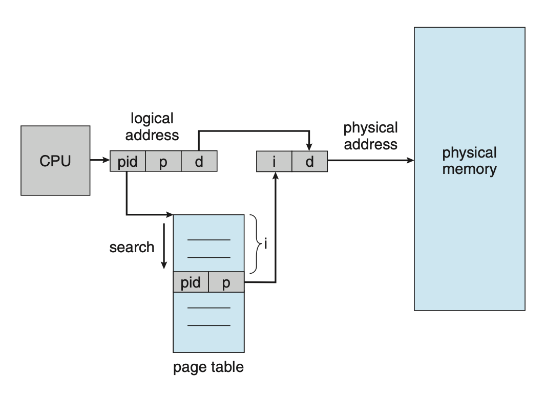 다시 말해, 주소 변환을 위해 페이지 번호를 찾아가는 것이 아니라, 물리적 프레임 번호를 통해 논리적 주소를 찾아가는 것입니다. 따라서 논리적 주소를 통해 물리적 주소를 알아내려면 전체 페이지 테이블을 검색해야합니다. 이를 위해서 페이지 번호와 함께 해당 페이지가 어떤 프로세스 것인지를 나타내는 프로세스 ID(pid)도 함께 저장됩니다.