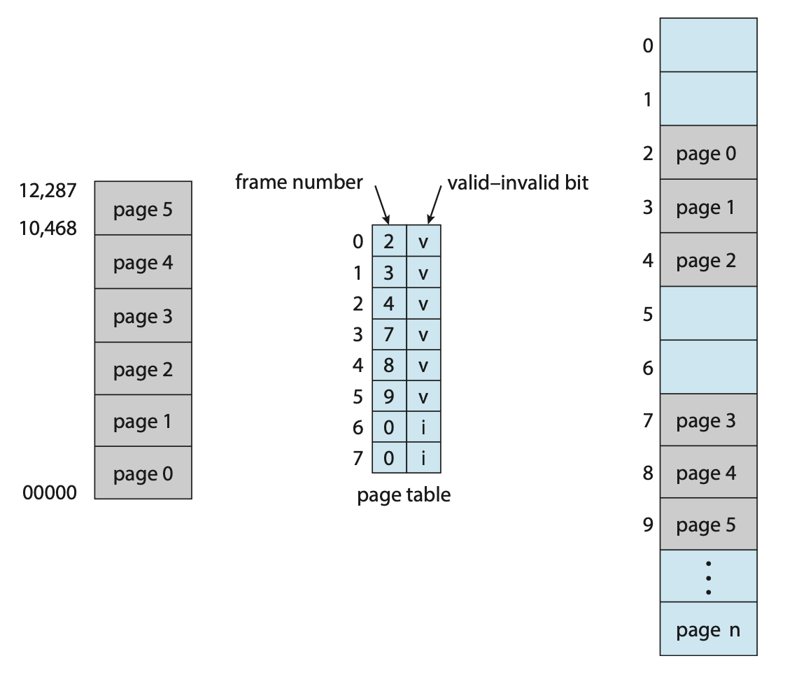 위 그림에서는 논리적 메모리가 Page 5번까지 존재하고, 6, 7은 사용되지 않는 페이지임에도 페이지 테이블에 6번과 7번 엔트리가 존재하는 것을 볼 수 있습니다. 엔트리는 존재하지만, 6번과 7번 페이지는 없기 때문에 사용되지 않는다는 의미인 Valid-Invalid bit가 Invalid로 표시됩니다.