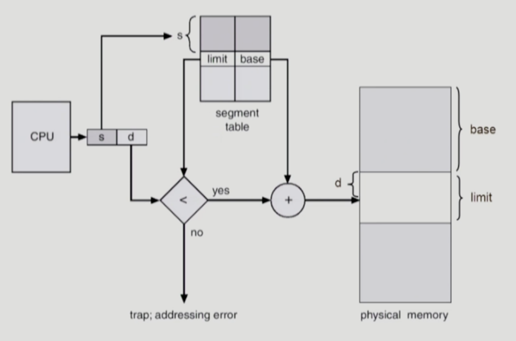 CPU가 논리 주소를 주게 되면, 이 논리 주소는 Segment 번호(그림의 s)와 Segment Offset(그림의 d)으로 나뉩니다. 그리고 Segment Table의 시작 위치는 STBR이 가지고 있습니다. Offset 만큼 떨어진 곳에 가면 이 세그먼트가 물리적 메모리의 어디에 위치하는지에 대한 정보가 있습니다.