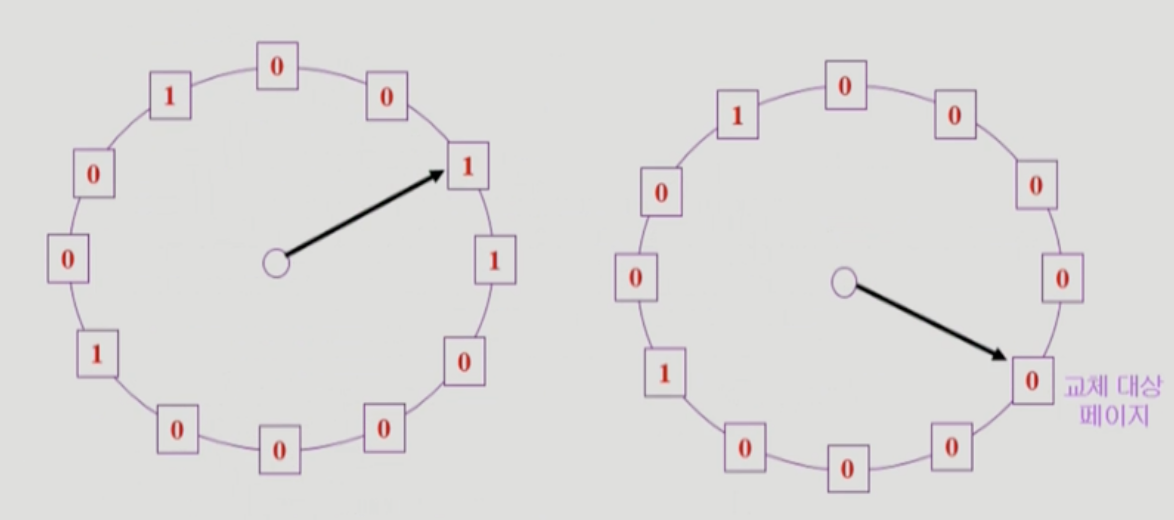 Page Fault가 발생하여 페이지를 교체해야 할 때, 운영체제는 하드웨어가 세팅해놓은 Reference Bit을 확인합니다. 포인터가 페이지들을 순환하면서 Reference Bit을 확인합니다. 만약 Reference Bit가 1이라면, 최근에 참조된 페이지입니다. 따라서 Reference Bit이 1인 페이지를 만나기 전까지 확인합니다. 만약 한 바퀴를 돌았는데도 Reference Bit이 0이면, 그때에는 해당 페이지를 교체합니다.