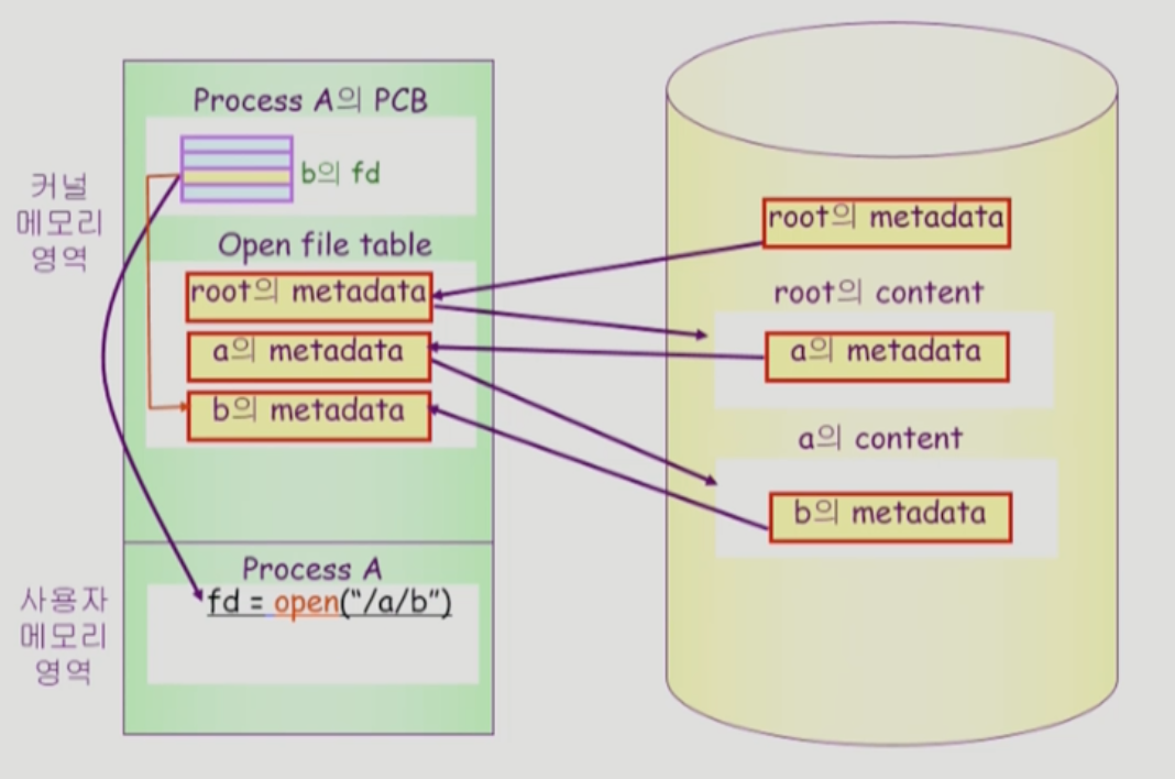b라는 파일에 대해 read/write를 하면 디스크의 어디에 위치하는지 root directory부터 찾을 필요가 없습니다. b의 메타데이터는 이미 메모리에 올라와있고, 그것에 대한 위치는 File Descriptor(fd)가 가지고 있습니다. 그래서 사용자 프로세스는 File Descriptor 인덱스 (정수값)을 통해 read/write 요청을 할 수 있습니다.