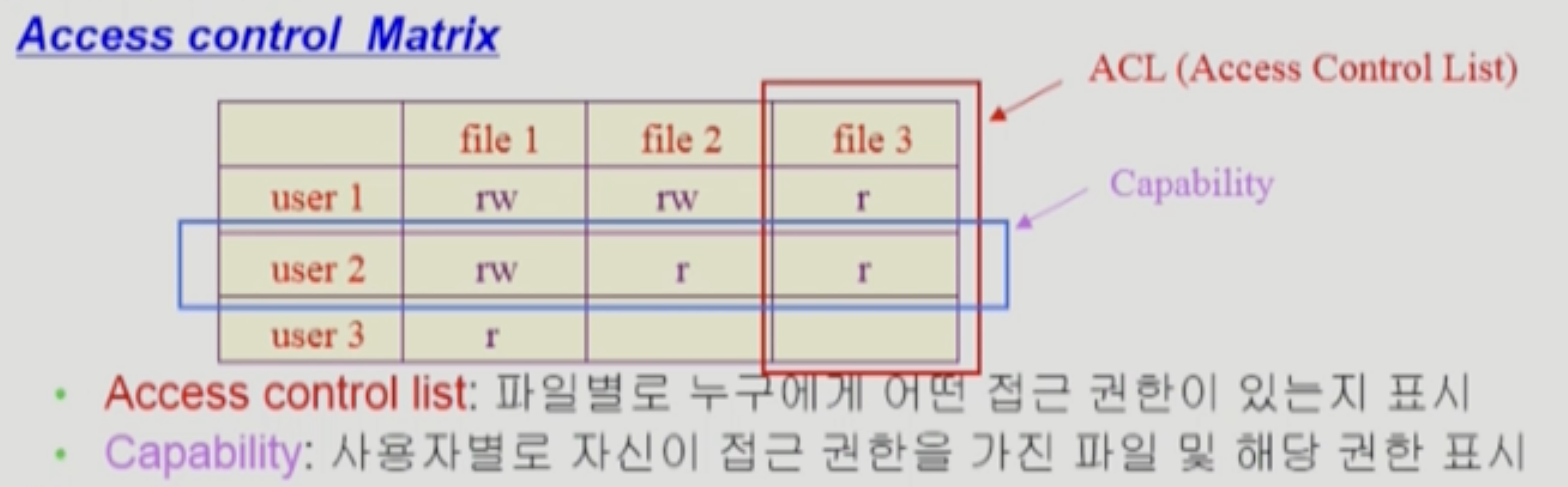 반면 File에 대한 Protection은 접근 권한이 누구한테 있는지와 어떤 연산이 가능한지에 대한 정보를 가지고 있어야 합니다.