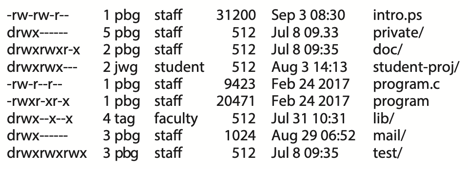 일반적인 운영체제에서 사용하는 방법입니다. 각각의 파일에 대해 사용자 그룹을 세 가지(owner, group, public)로 나눕니다. 그리고 각 파일에 대해 세 그룹의 접근 권한(rwx)을 3비트씩 표시합니다.