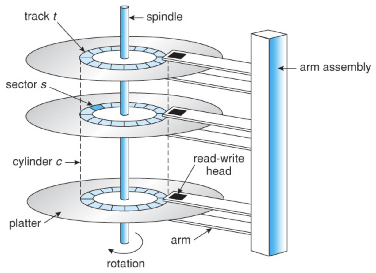 디스크는 원판(plotter), 팔(arm), 헤드(head)로 구성되어 있습니다.