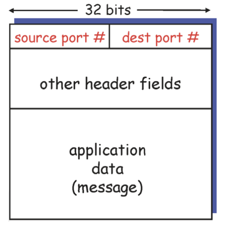 헤더(header)에는 전송 측의 포트(source port #)와 목표 포트(dest port #), 그리고 기타(other header fields)가 들어갑니다.