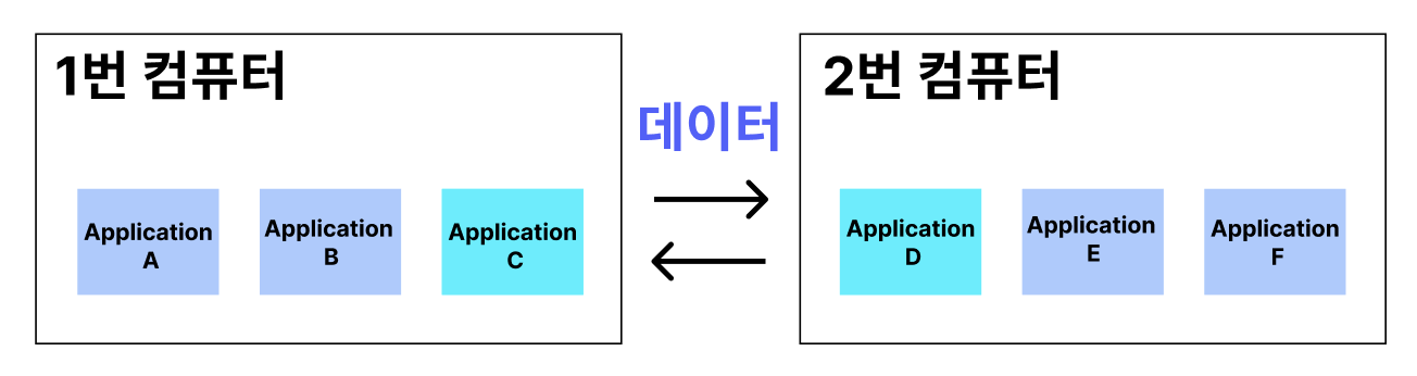 네트워크 상에서, 컴퓨터(집)는 서로 데이터(편지)를 주고 받습니다. 각 컴퓨터는 여러 애플리케이션(집안의 사람)을 실행하고 있고, 각 애플리케이션은 데이터를 주고 받고 싶어 합니다.