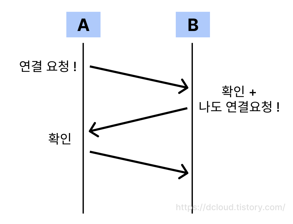 두 컴퓨터가 서로 연결을 하기 위해서는 A에서 B에게 보내는 연결 요청과 그에 대한 응답. 그리고 B가 A에게 보내는 연결 요청과 그에 대한 응답으로 구성되는 것을 볼 수 있습니다. 서로 간에 요청과 피드백을 받으면 논리적으로 연결되었다는 것이 확인이 되는 것입니다. 이것을 세번 악수하는 과정으로 생각하는 것입니다.