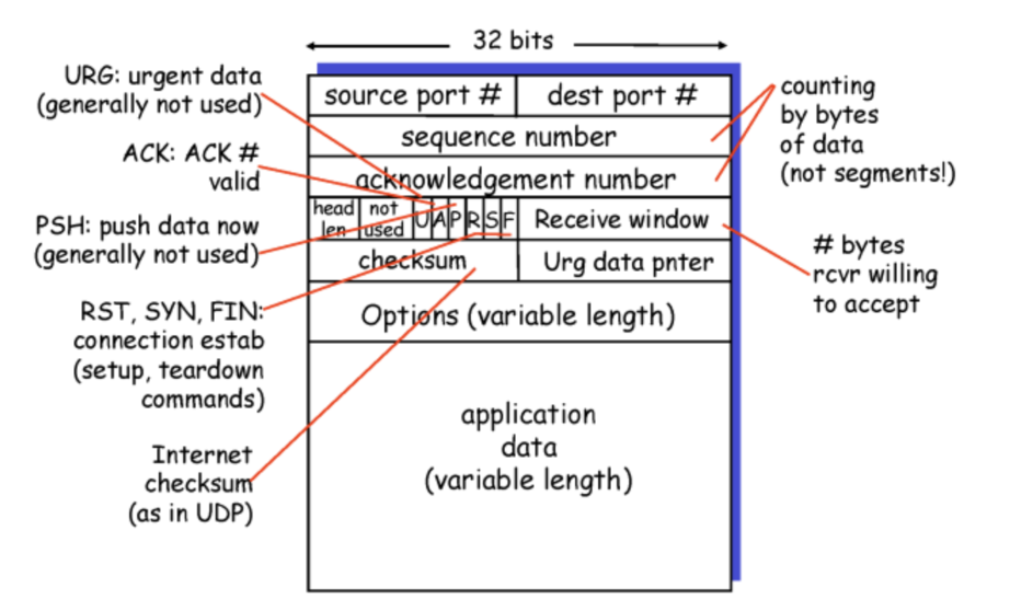 세그먼트 헤더의 4번째 줄을 보면 U, A, P, R, S, F를 볼 수 있습니다. 여기서 A는 ACK, S는 SYN, F는 FIN 비트를 의미하는 것입니다. 이 비트를 통해 상태를 주고 받습니다.