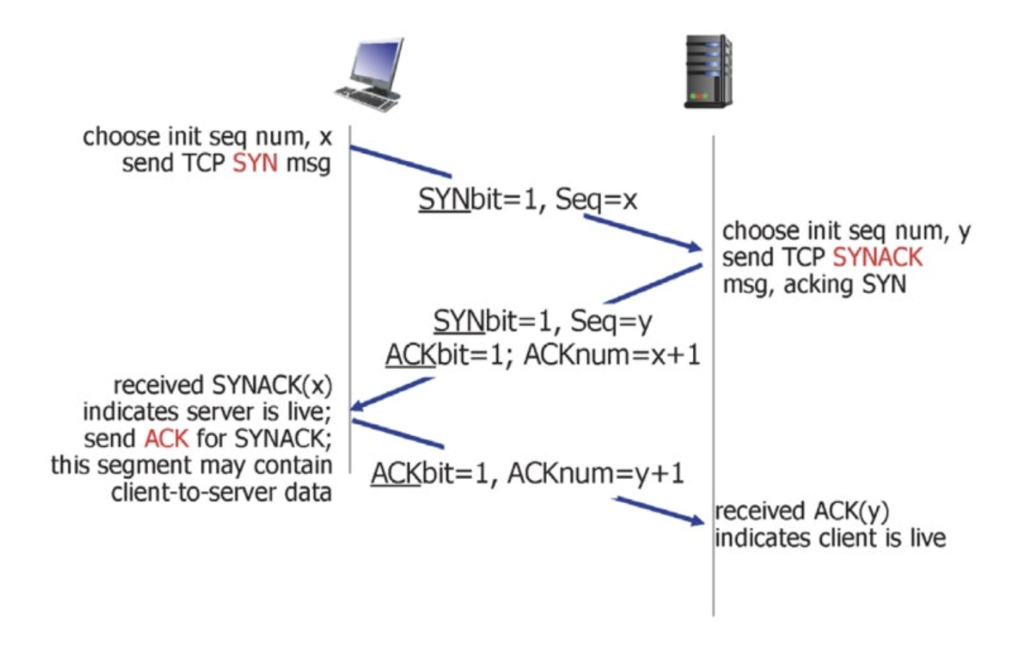 이제 연결 요청은 SYN, 확인 피드백은 ACK로 대입한다면 위 그림을 쉽게 이해할 수 있습니다. 왼쪽의 컴퓨터가 클라이언트, 오른쪽의 컴퓨터가 서버입니다.