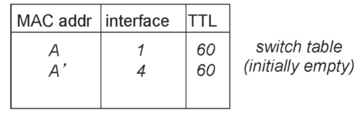 이제 스위치는 도착지인 A'의 정보를 알아야합니다. 그래서 Switch는 모든 host에게 이 frame을 broadcast 방식으로 전송하게 됩니다. 그럼 해당하는 4번 포트가 응답을 하고, 스위치는 응답을 받아 A'의 위치를 4번으로 Switch Table에 저장하게 됩니다.